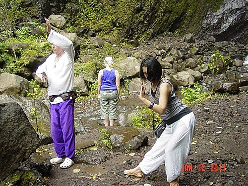 在現場只有細雨綿綿夾雜著瀑布水柱衝下所濺起的水花,令人覺得十分清爽,整體磁場感覺也很好。內人在現場就練起了自發動功,過了一會兒,見 Don 也逐漸閉起眼睛,然後開始比劃起來,我看不太懂 Don 練的是那門那派,但覺得跟內人的動作有點像 (動作有點慢半拍)?