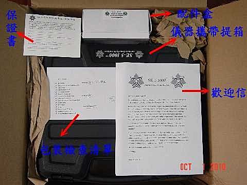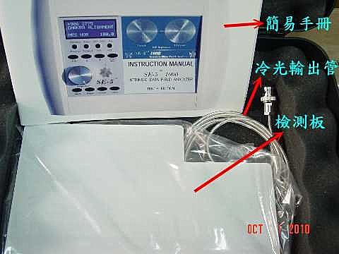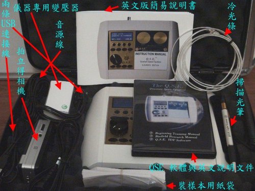 打開 Q.S.E. 黑色的儀器攜帶提箱 (內有儀器) 後,可以看到 英文版簡易說明書、掃瞄光筆、冷光條一條、USB 線 及 跟音源線 各一條、樣品放置袋 等。